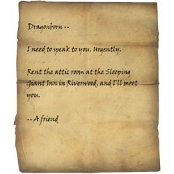 Later while the dragonborn is searching for the horn of jurgen windcaller the dragonborn finds the horn missing and in its place a mysterious note telling them to head to the sleeping giant in riverwood and rent the attic room.